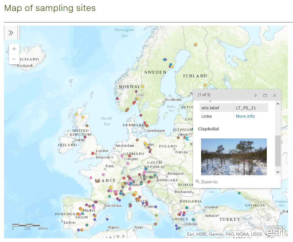 You can explore the map by clicking on the arrows in the top left corner, where a legend appears explaining to what species each color is associated. By clicking on the dots, more information about the site will pop up, together with a photo and a link to more information, such as additional images, blogs or other resources.
