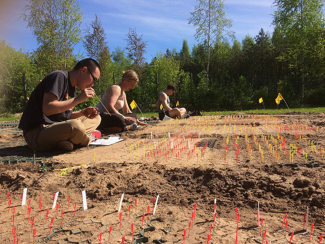 The picture shows a common garden experiment at the University of Oulu in Finland. As part of GenTree we sowed Scots pine seedlings from different European geographic origins next to each other in the same field in Spring 2017.